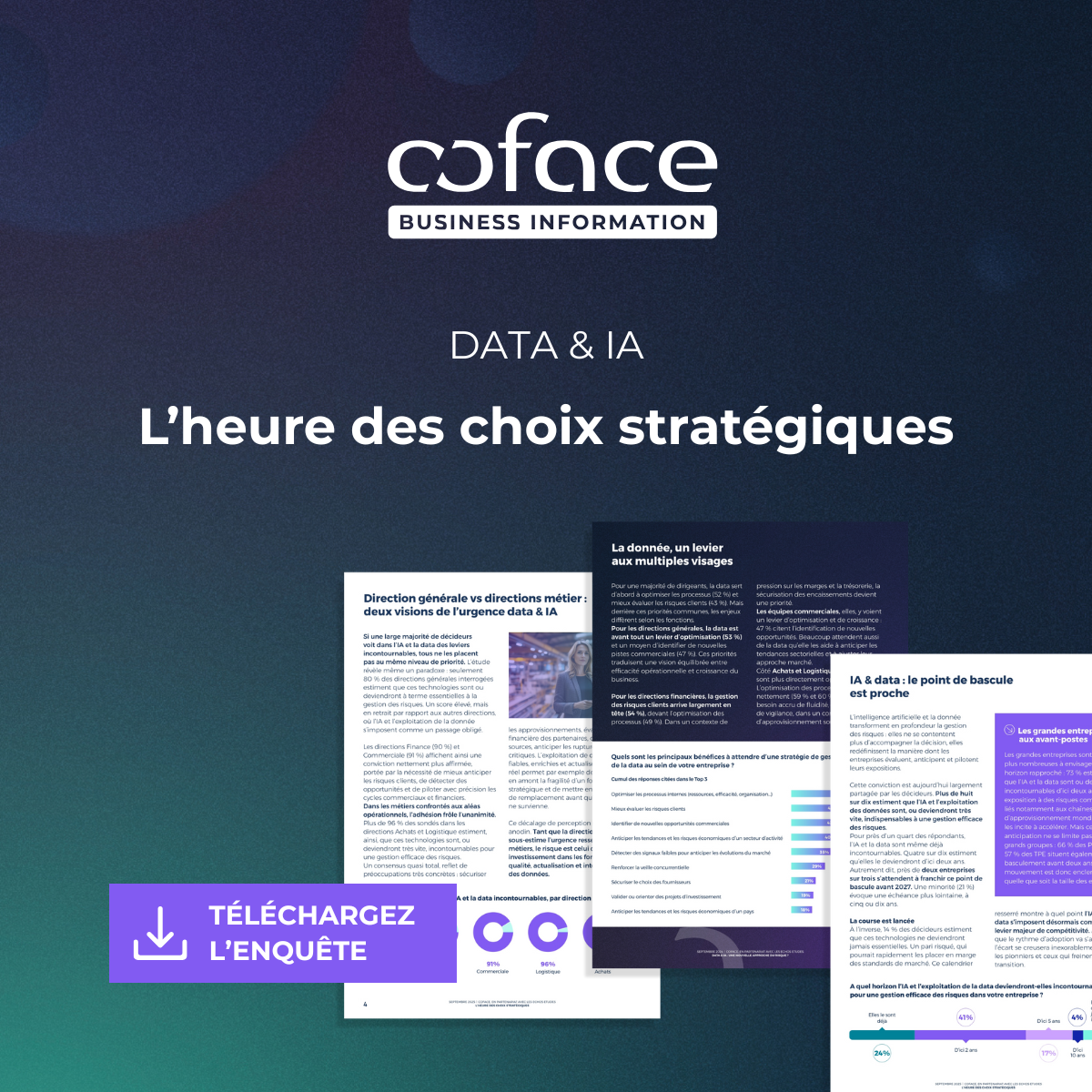 La donnée et l’intelligence artificielle sont au cœur des stratégies pour anticiper et détecter avant les autres. Pour mieux saisir l’ampleur de cette transformation, Coface a recueilli le point de vue de 855 dirigeants et décideurs, issus d’entreprises et de secteurs variés.